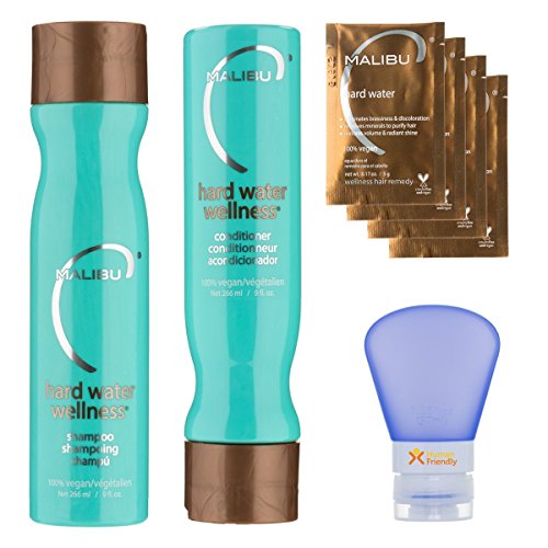 Studio : HumanFriendly Publisher : HumanFriendly Binding : Health and Beauty Product Description - Instantly feel your hair improve in shine and vibrancy with the most thorough system for removing and protecting your hair from oxidizing deposits, minerals and harsh chemical buildup in your water and environment. - Normalize your hair texture, restore natural color and eliminate brassiness. Great for use at home or in salons to prepare your hair for optimal results prior to chemical service such as color, perms, keratin, etc. - Includes 4 packets of Malibu-patented hard water crystals that dissolves into a highly effective gel treatment. This bundle also includes a 9 oz bottle of Hard Water Wellness Shampoo and 9 oz bottle of Hard Water Wellness Conditioner. - Includes HumanFriendly 1.25 oz leak-proof refillable silicone travel bottle. - 100% Vegan, Gluten-Free, Animal Cruelty-Free. Preservative-Free, Fragrance-Free, Sulfate-Free. 0