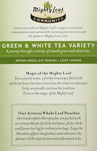 -. Feature : All-natural; uses whole tea leaves / Packaged in handcrafted silken pouches / Made with premium green tea leaves / Contains Mighty Leaf's most popular green teas; each tea is flavorful, lightly caffeinated and rich in antioxidants / Contains 15 pouches.
