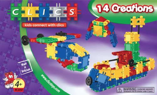 -. Feature : There are 50 Clics bricks, wheels, axels and a booklet for creation of 14 different models. / Make really unique objects including vehicles, animals, buildings, and much more. / Pieces easily click together easily. / Made in Belgium. / Clics set comes with illustrated diagrams which show you, step by step, how to build a number of objects.