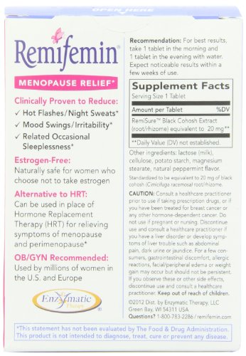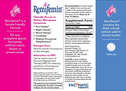 Remifemin menopause relief* Clinically Proven to Reduce Menopause Symptoms: Hot Flashes*, Night Sweats*, Mood Swings*, Irritability*, Related Occasional Sleeplessness*, Estrogen-Free, so it is Ideal for women choosing not to take estrogen -- alternative to HRT: can be used in place of Hormone Replacement Therapy (HRT) for relieving symptoms of menopause and perimenopause* RemiSure extract is standardizedto be equivalent to 20 mg of black cohosh (Cimicifuga racemosa) root/rhizome