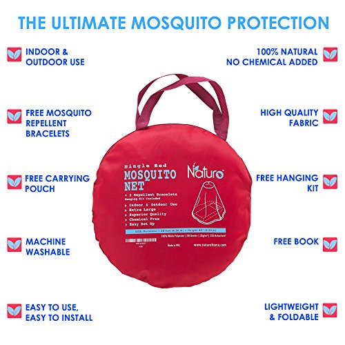 -. Feature : PERFECT PROTECTION AGAINST INSECTS & MOSQUITOES: Summer is coming and mosquitoes are partying around us! Keep yourself and your family protected with this ultimate mosquito net for bed and for outdoors! Its high quality fabric can guarantee mosquito free nights and 100% eco-friendly soft touch around you! No chemicals added! Being washable and lightweight will facilitate its cleaning process and you can take it with you everywhere you go! / EASY TO USE & HASSLE FREE INSTALLATION - INDOORS AND OUTDOORS: Install this mosquito repellent net without breaking a sweat! You can use it indoors or even outdoors while camping! It has a comfortable entrance and as you open it you can conveniently enter and then close the net! Easy peasy, right? This safety mosquito screen not only will keep the mosquitoes away, but can also offer you romantic nights in your bedroom or under the stars! / 2 100% NATURAL MOSQUITO REPELLENT BRACELETS BONUS: Do you feel like using some extra protection? No worries there. We got you covered! 2 extra mosquito repellent wristbands for you and your friend. The mosquito repellent bracelet is deet free and made from 100% pure and natural essential oil. Totally safe for you and your children. Up to 250 hours of protection! Let your kids play in the park without any blood sucking creatures lurking! / HANGING KIT / STORAGE BAG / E-BOOK & 100% SATISFACTION GUARANTEE: We here at NATURO have the customers' best interest at heart! That is why, we offer you the ultimate set that includes the mosquito net, 2 mosquito repellent bracelets, a full hanging kit (includes wall mounts and rope) and all these nice and tidy in a fine carrying bag. Last but not least you will get an E-book "Camping & Outdoor Recipes" and our 100% satisfaction guarantee! / • EXTRA LARGE NET FOR EXTRA SAFETY: Our mosquito net bed canopy is cleverly crafted so as to bear the tiniest holes (225 holes /2 inches) that lets the cool breeze reach you while preventing mosquitoes and other annoying insects from entering while you are enjoying your nap! Plus, it is the largest mosquito net in the market (perimeter=40 fitX98" height). Suitable for any type of bed. Either a king size bed, toddlers bed or a cute mosquito net for crib ! It works no matter where you place it!