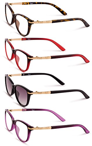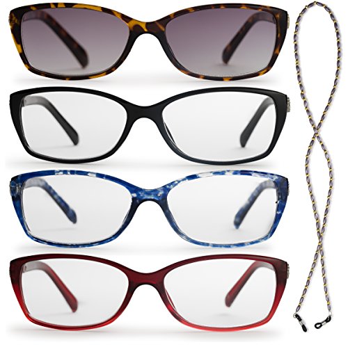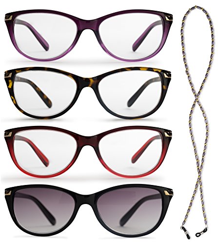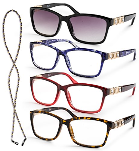 -. Feature : These reading glasses have high quality spring hinges to ensure that they'll stretch on with minimal effort and then ensure maximum comfort while wearing them. In addition, these readers are lightweight and super comfortable / Quilted look on the temples with crystals inlaid into the design / The magnification strength in the lenses are accurate and are made from quality and crystal clear material that is scratch resistant enabling you to read small texts and minute details without stress / The ultimate set of 4 reading glasses enable you to leave them in the most convenient and favorite reading spots around the house, or have another one to take along with you so you have it where you need it most / Includes carrying pouch with drawstring and a microfiber cleaning cloth plus free additional gift: beautiful crystal beaded chain