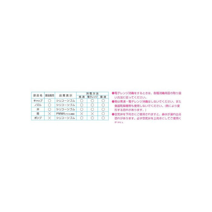 [소재] 펌프:천연,고무밸브(적색):실리콘 고무,캡:PS수지,통:PS수지,노즐:실리콘 고무