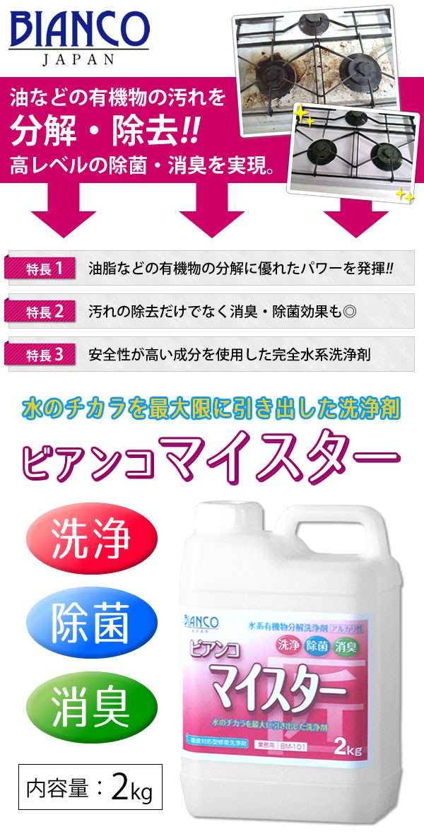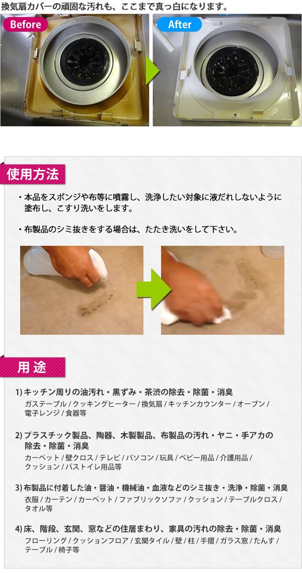 | <h1>環境負荷が低く、毒性のない洗浄剤です。残存率が非常に低く、生分解性に非常に優れています。キッチン周りの油汚れや黒ずみ、布製品・家具の汚れの除去などに使用可能です。さらに高レベルの除菌・消臭を実現♪</h1> |