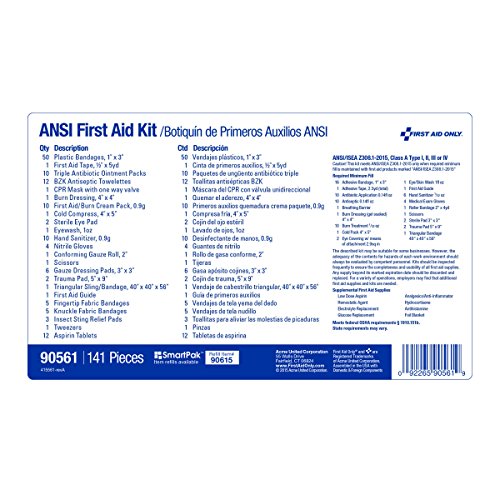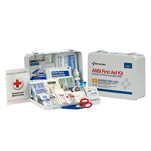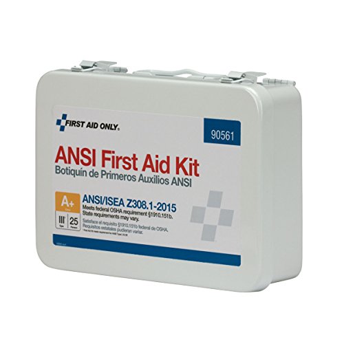 -. Binding : Misc. -. Brand : First Aid Only -. EAN : 0092265905619 -. Feature : Weatherproof case comes with a carrying handle / Contents exceed the 2015 ANSI Class A requirements / Sufficient to treat 25 or more people -. Label : Pac-Kit -. Manufacturer : Pac-Kit -. Model : 90561 -. MPN : 90561 -. NumberOfItems : 1 -. PackageQuantity : 1 -. PartNumber : 90561 -. ProductGroup : BISS Basic -. ProductTypeName : SAFETY_SUPPLY -. Publisher : Pac-Kit -. Size : 25 Person -. Studio : Pac-Kit -. Title : First Aid Only 90561 ANSI 2015 Compliant 25 Person Bulk Class A+, First Aid Kit, Metal, Weatherproof -. UPC : 092265905619