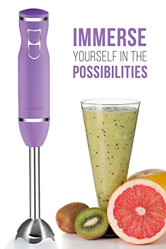 Handle all your blending needs with ease using the Chefman Immersion Blender. Equipped with a powerful 300-Watt ultra-quiet motor, this immersion hand blender quickly purees soups, blends batters, smoothies and more, so you can make delicious creations in seconds. Make your dishes as smooth as our silk-touch feel; the mixers unique blade provides extremely smooth and even blending, while its protective blade guard helps prevent splattering. With a sleek stick design it easily reaches into mixing bowls, large cooking pots, and pitchers so you can blend an array of items conveniently and hassle free. The lightweight design, easy to-grip ergonomic handle, and simple push-button control make this the ultimate tool for a variety of blending needs. Detachable parts are dishwasher safe, making this stick blender as easy to clean as it is to use. Immerse yourself in the possibilities!Feature