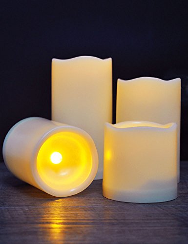 - SET OF 4 WATERPROOF FLAMELESS CANDLES WITH REALISTIC FLICKERING AMBER GLOW - The wavy edge candle has a slight amber flicker and the flame sits inside the candle to give you a REALISTIC APPEARANCE & SERENE AMBIENCE - Unlike real wax LED candles, our IP44 waterproof lifelike candles can be placed anywhere even they are directly exposed to sunlight or harsh indoor lighting - Cluster the candles together or scatter them around the home to set a cozy mood throughout - Pet-safe and kid-friendly.