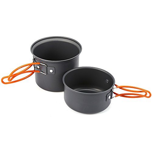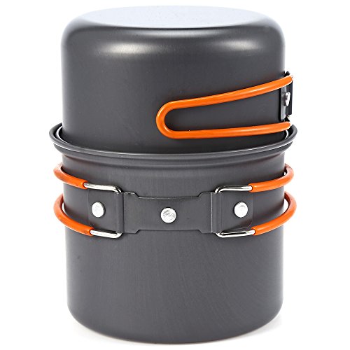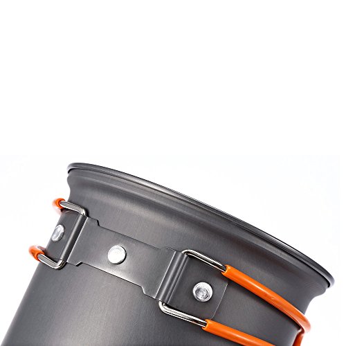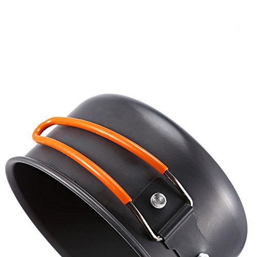 -. Feature : - Both the pot and pan have folding handles for space saving and compactness. / - Perfect for camping, backpacking, hiking, emergency preparedness, or as part of a survival kit. / - Foldable handle for easy storage, with silicone tube cover to protect your hands from burning. / - Hard oxidation treatment, high hardness, wear resistance, corrosion resistance.