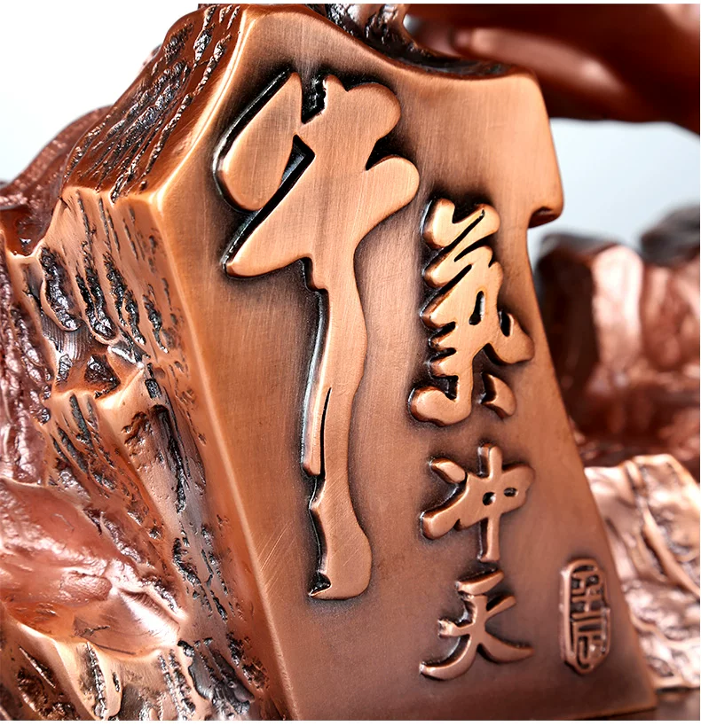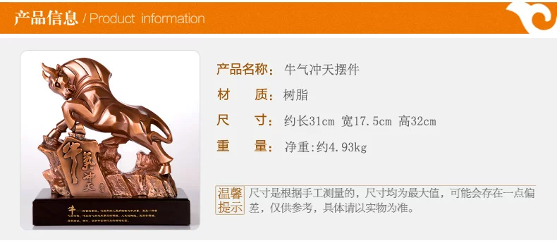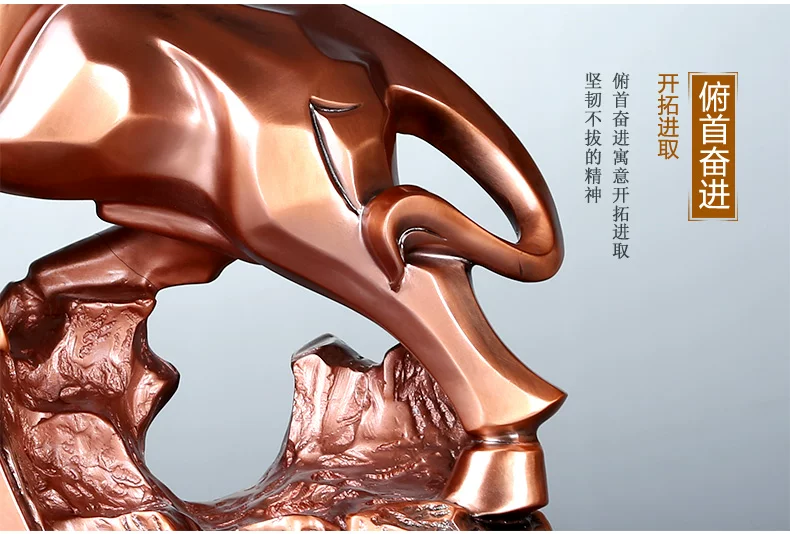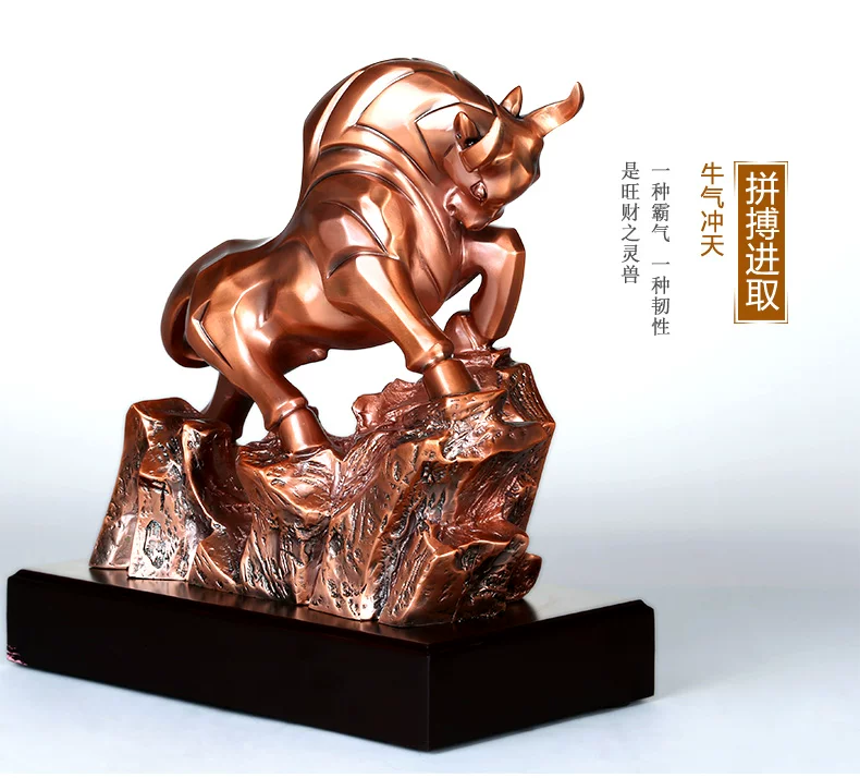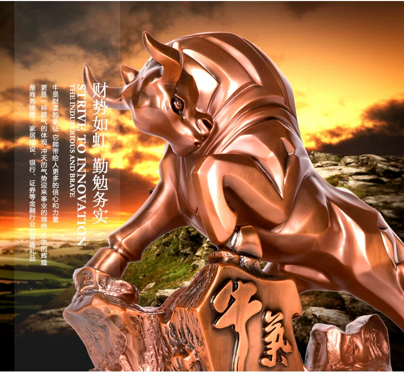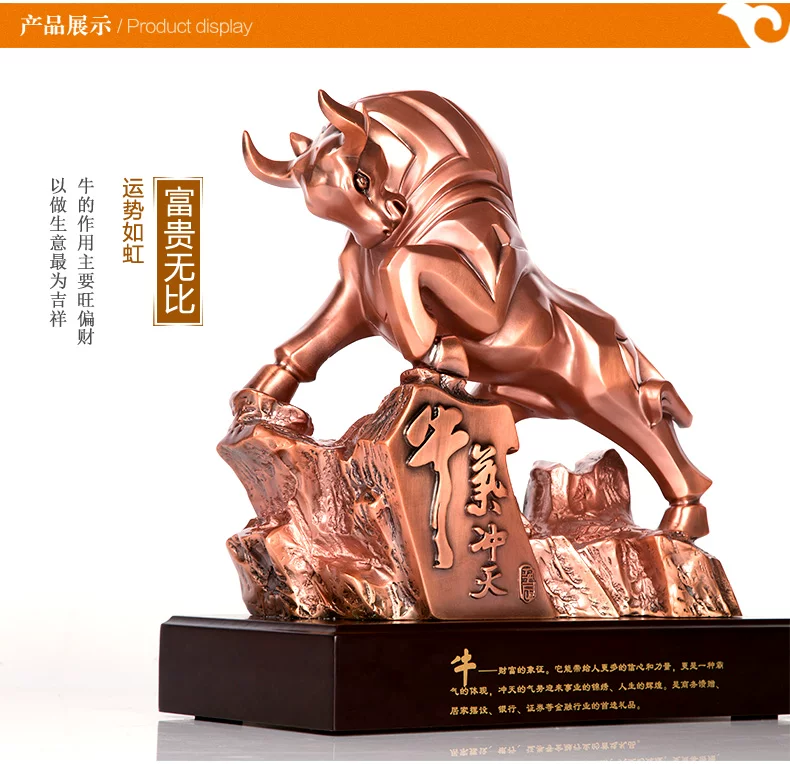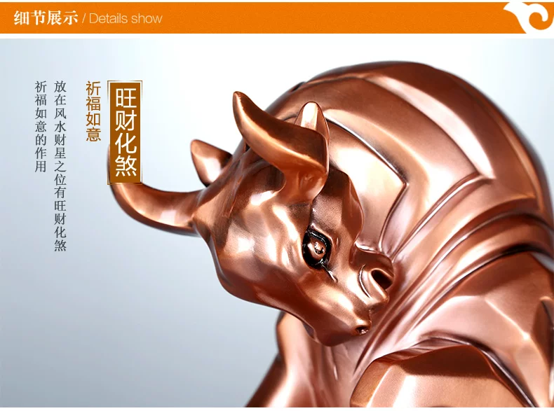 公牛是树脂镀铜色精铸而成,招财进宝,富贵无比。黄铜色在业内有"小黄金"之称,价格便宜,又不乏黄金的光辉灿烂。黄铜色公牛据信有强旺财运,特别是偏财财运的作用。待别是对于在正式工作之余,兼职做求财营生的人来说,其于财运尤其有莫大的助益。系炒股、房地产、金融、财经及银行等人士案头必备旺财之宝。