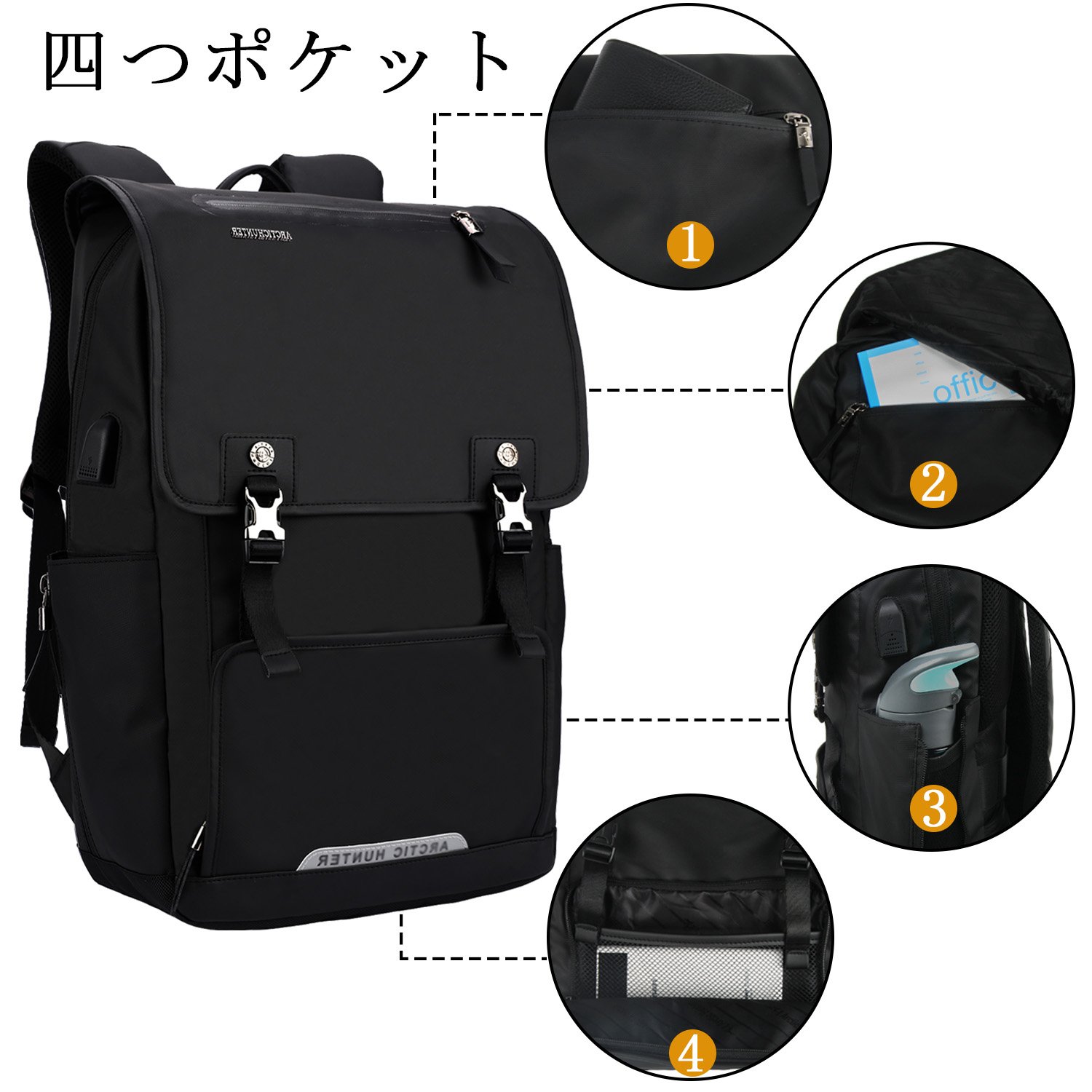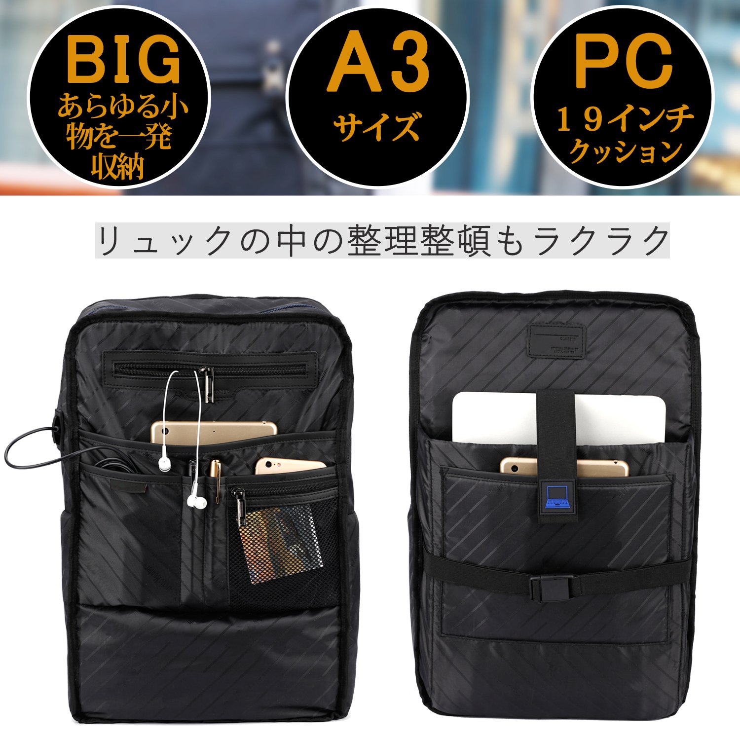 iPad, mobile battery, pens, lots of various small items such as books and documents are put in many storage pockets are attached.