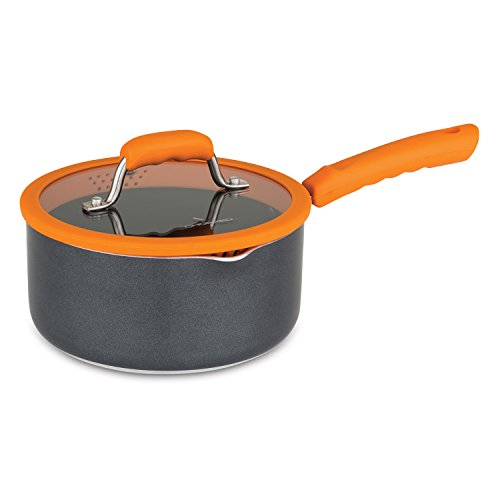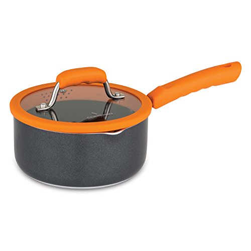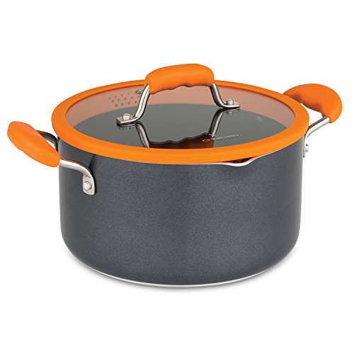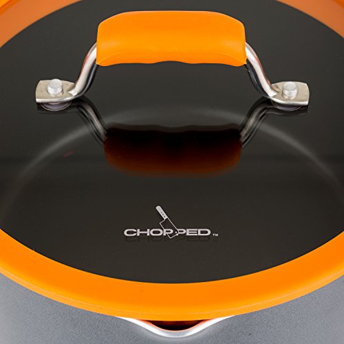 Inspired by the fast paced culinary competition show, Chopped cookware allows you to prepare a meal with confidence, agility and time to spare. The Chopped 10pc aluminum cookware set is built to withstand many everyday cooking challenges with built in silicone straining lids and dual handed pour spouts. The silicone rims on the lids grip the pan providing a firm fit. Each lid features two different sized strainer holes that work with the built in spouts to allow you to save time and strain directly from the pan, speeding up the cooking process and eliminating the need for additional colanders or straining devices. The straining lids are especially handy when cooking pastas or straining out soups and stocks. The dual sided pour spouts on the sauce pans and stock pots are designed to work with both a right and left handed grip depending on which is most comfortable for you. The pour spouts themselves can be used with or without the straining lid and eliminate drips down the side of the pan when pouring As an added benefit, the vented glass Lids with silicone rims hold moisture for more flavorful cooking while reducing the opportunity for boil-overs. Delivering a winning dish requires consistency every time. The three millimeter heavy gauge aluminum construction minimizes hot spots by distributing heat evenly throughout the pan for the ultimate cooking performance. The stay cool ergonomic handles give you the agility to move quickly by not necessarily needing a hot pad to move the pan on the stove.Feature