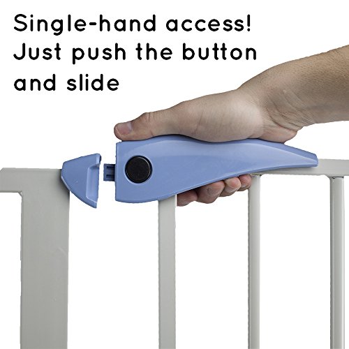 - Feature : No more stepping over gates, no more pushing them aside--simply Walk-Thru! Great for pets and mobile infants and toddlers alike / Strong, steel gate that secures doorways and other openings between 29" and 35" wide / Pressure-mounting ensures a snug, secure fit every time. All necessary hardware included / Double-locking mechanism, single-hand access. Just push the button, then slide! / Includes a floor latch which transforms free-swinging gate into one-way entrance or exit