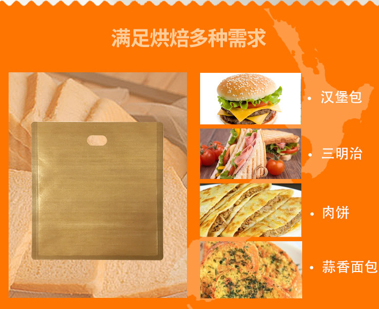 Can be used for all kinds of ovens, ovens, microwave ovens and other heating appliances, to prevent the overflow of oil in the baking process overflow flow to the bottom of the oven, sandwiches, bread and other food into the bread bag, and then heated in the oven, the food will not Adhesion in the oven, heat evenly. Toaster bottom will not have residue falling!