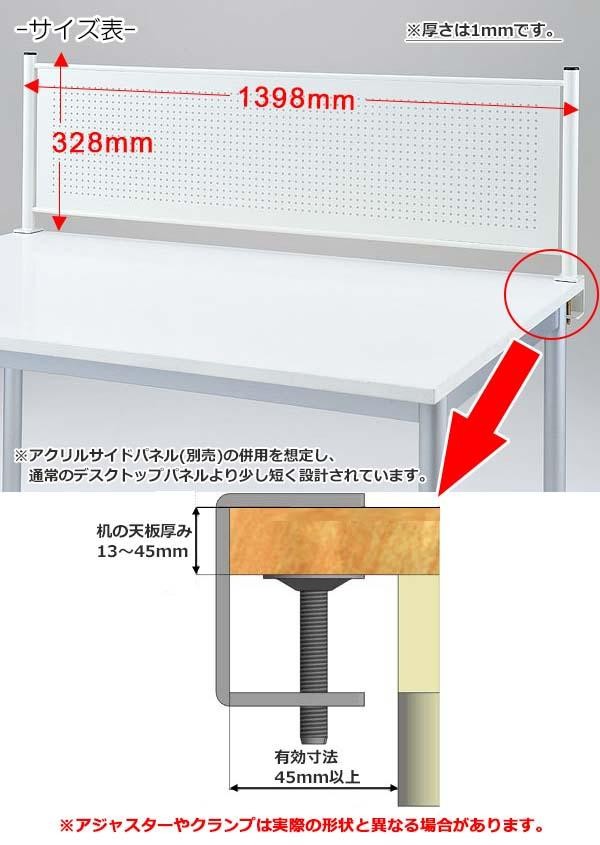 | スチール製のデスクトップパネルです♪スチール製なので、メモなどをマグネットで貼り付けることができます。取り付け方法はクランプ式を採用しており、デスクの端に金具で固定をするだけ!!パネルのパンチングは適度に明かりを取り入れ、明るい状態で視線を遮ります。配線などを通せるように、パネルの下に少し隙間を設けています。 |