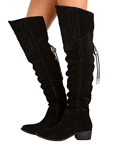 Binding : Apparel Product Description Knee-high silhouette with angled shaft opening. Braided bolero detail in the back. Hidden zip-closure along the instep. Almond toe. Leather lining. Lightly-padded footbed. Stacked heel. 'Go Sit On A Cactus' embossed synthetic outsole leaves fun footprints. Made in Brazil. 0