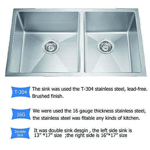 Monise 32”inch Double Bowl Kithcen Sink T-304 Stainless Steel Lead Free Handmade Home Sinks 32"X19"X10"Kitchen Sink