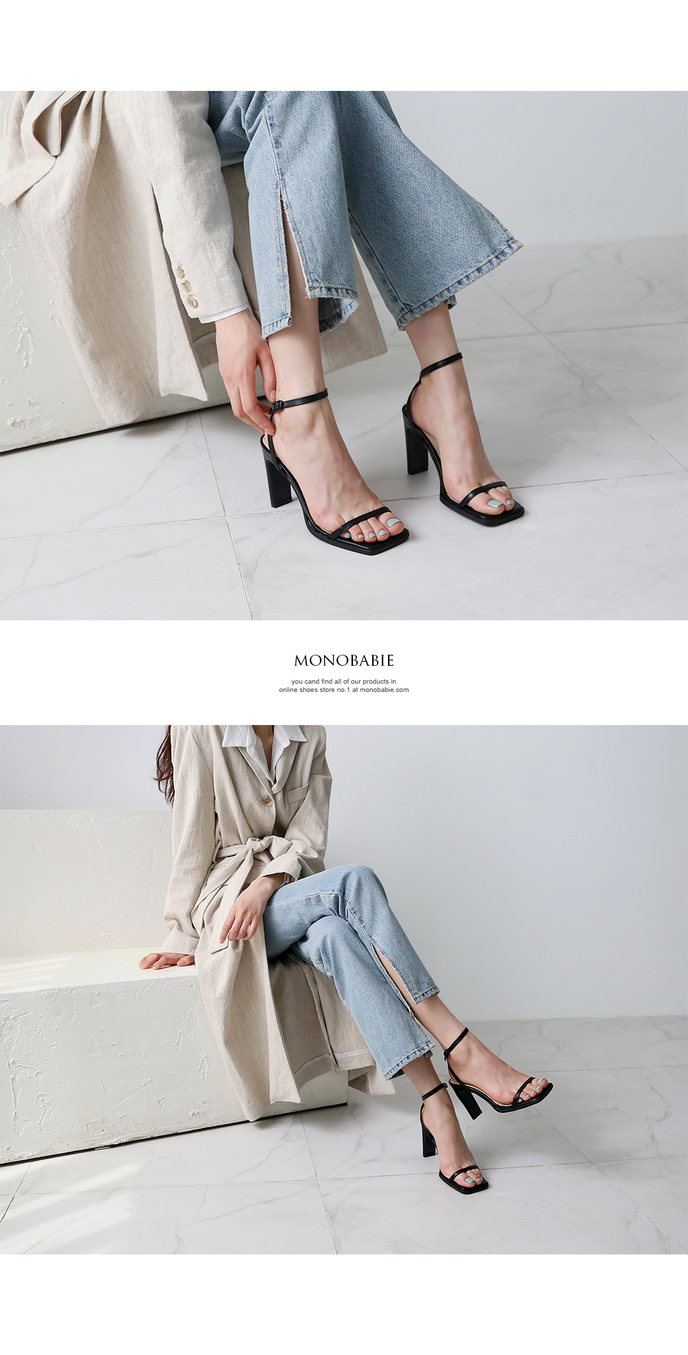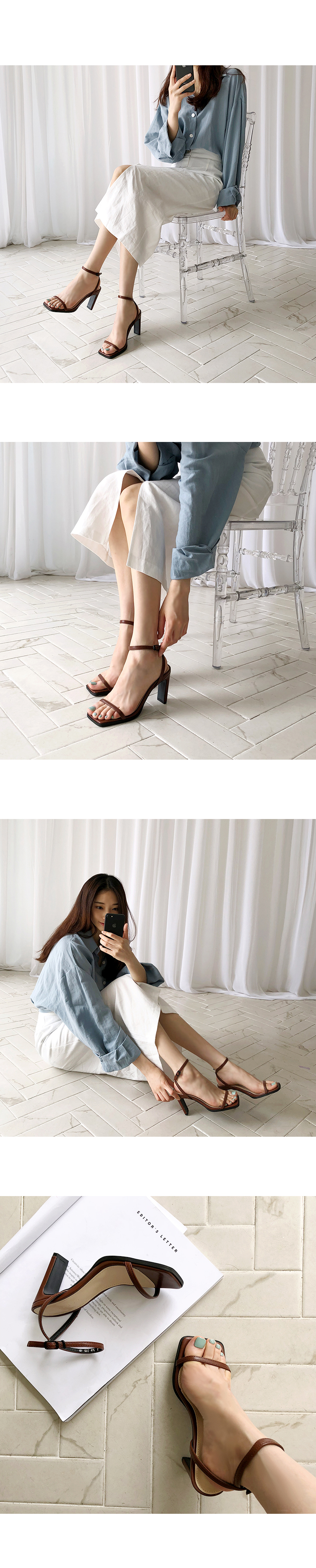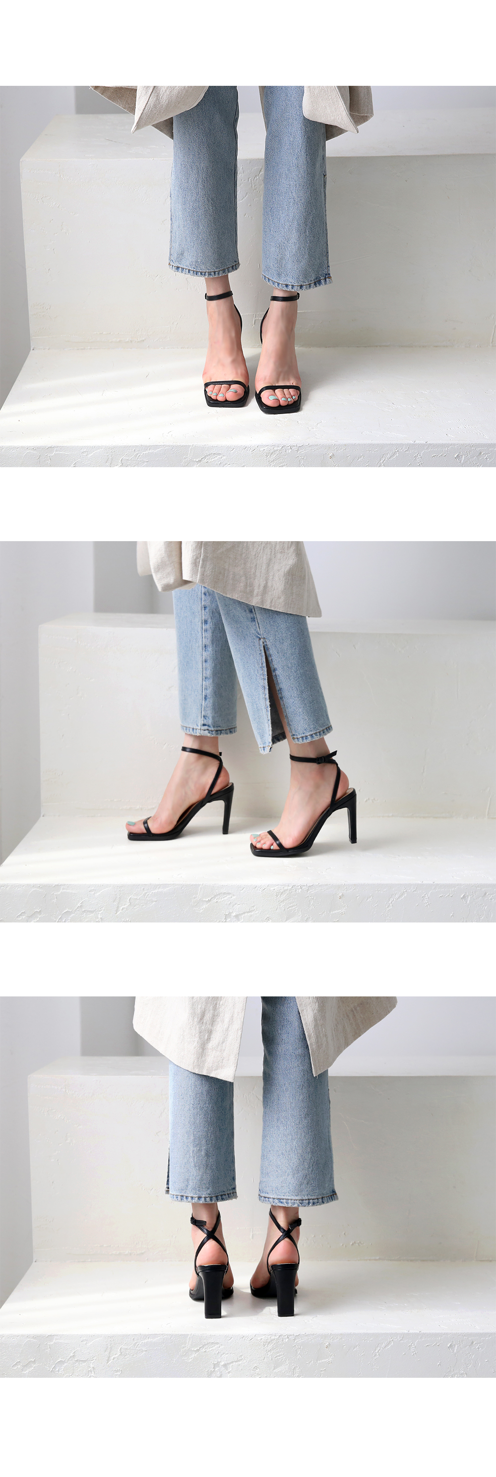 스트랩이 뒷꿈치와 발목을 감싸주면서 착화 시 안정적이고 여리여리한 핏을 연출해줍니다.