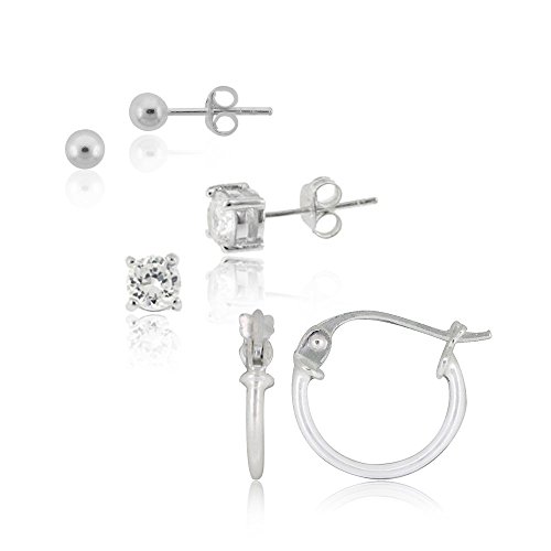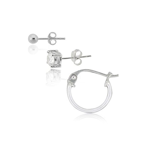 -. Title : Hoops & Loops Sterling Silver Cubic Zirconia Round Stud, Hoop and Bead Stud Earrings Set