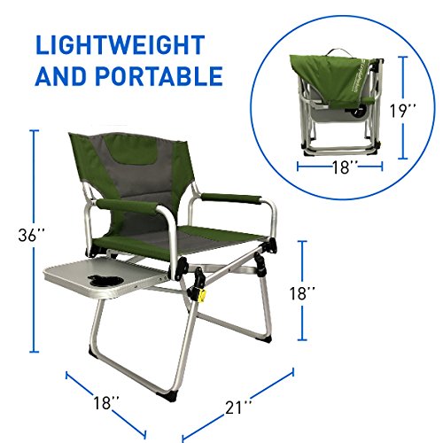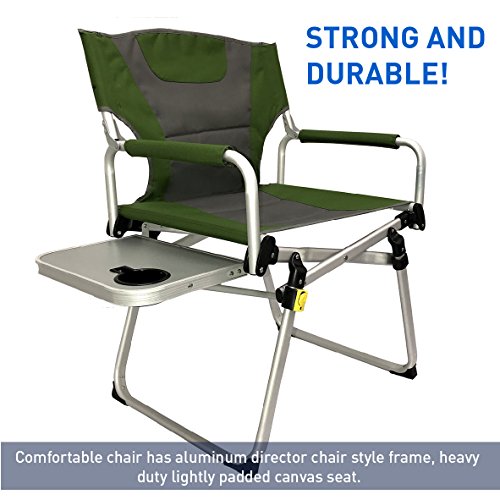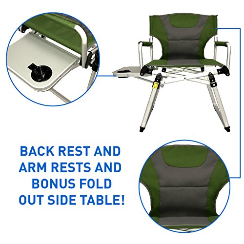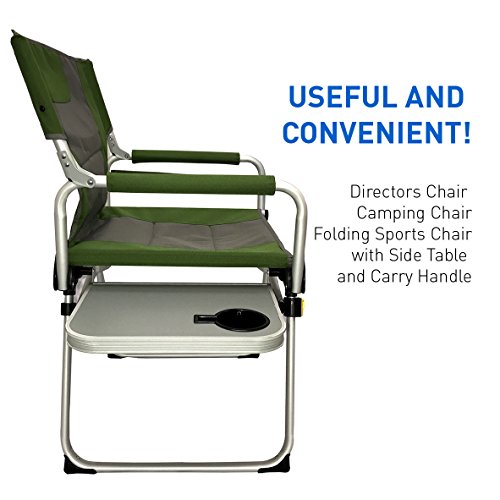 USEFUL AND CONVENIENT! Directors Chair – Camping Chair – Folding Sports Chair with Side Table and Carry Handle – Green with Gray Trim.