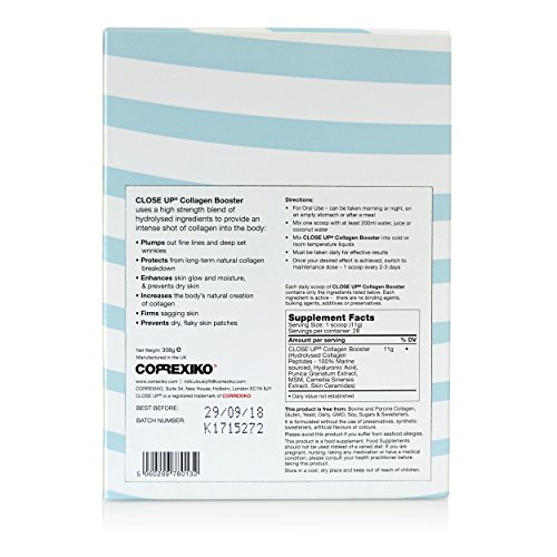 -. Feature : HOW WE'RE DIFFERENT - Unlike other collagen supplements on the market, we create advanced, results-led blends that radically improve your beauty regime. Simply put, it is MORE EFFECTIVE than the commonly found plain marine collagen powders. This means you'll experience much more beautiful, glowing & younger looking skin. / HIGHER BIO-AVAILABILITY - Our studies show ultra-fast uptake to skin cells within 2 hours of ingestion for faster, visible results. / LOW MOLECULAR WEIGHT - Formulated with a unique Low Molecular weight (Low Dalton) Marine Collagen Peptide, CORREXIKO's Collagen Booster strengthens your body collagen's regenerative ability and helps slow down intrinsic skin ageing. It stabilizes the collagen matrix, promoting collagen biosynthesis which makes skin look younger. / SUSTAINABLY SOURCED. Our Marine Collagen only uses sustainable cold water fish from Norwegian waters. / A BRAND YOU CAN TRUST - Having a Medical Doctor from London as one of its founders, CORREXIKO's products are solely manufactured in the UK. We specialize in effective, results-led blends that improve and enhance the look of your skin and body; and we achieve this using only clean supplements - which means we will never use additives, bulking agents, sugars, sweeteners or fillers.