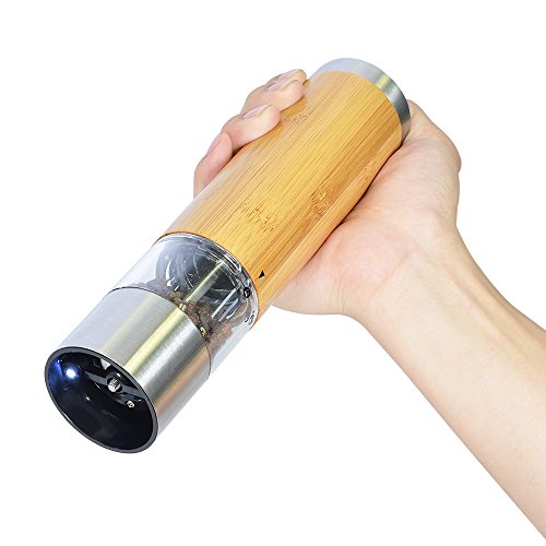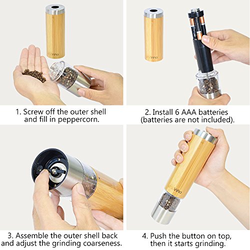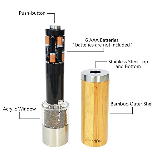Easy to use: Unscrew the cap on the top to open the mill. Fill the spice in to the grinder. Once filled, crank the grinder and body make it simple to see the level of the spice left inside the grinder and grind by pushing the top button. Easy to adjust controller for either fine or coarse grinding. An LED light at the bottom of the grinder helps with accurate portion control in a dim environment. Requires 6 AAA Batteries. (Batteries is not included)