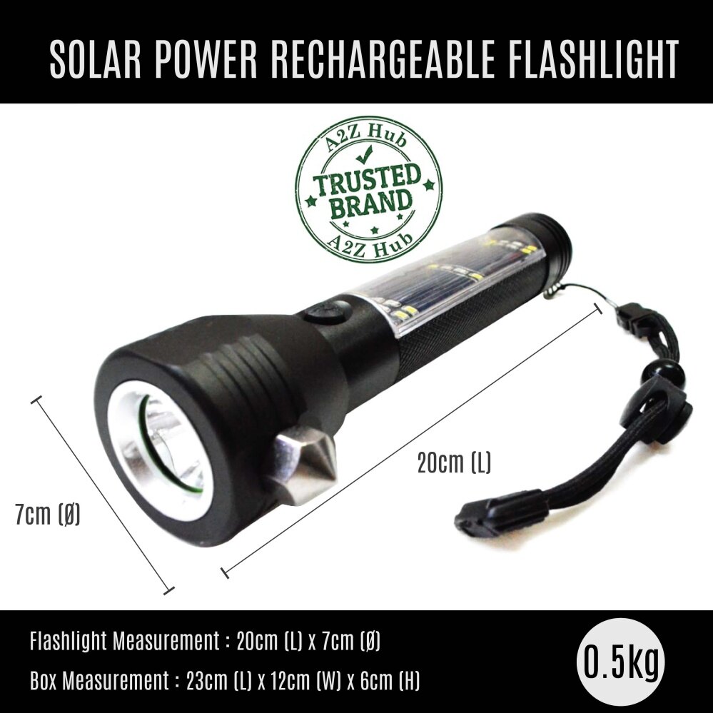 7 in 1 Emergency Multi Function Solar Powered Flashlight contains a flashlight, a Red Colored LED Warning Light, Hardened Alloy Safety Hammer, Built-in Seat Belt Cutter, Outdoor Compass, A Magnet Button and an Emergency Power Bank. It is The Best Household Tool During a Blackout, Ideal for Camping, Hunting, Hiking, Outdoor Activities, Emergencies, as well as For Self Defence.