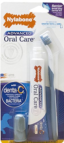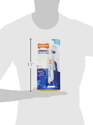Preventative dental care reduces the risk of developing oral disease, which can lead to serious issues for dogs. Establishing a daily routine of proper dental care may extend the life of your pet. This veterinarian-recommended Nyla bone Advanced Oral Care Puppy Complete Dental Kit includes everything your puppy needs for regular brushing, including a toothbrush, a finger brush, and 2 1/2 ounces of Advanced Oral Care Tartar-Control Toothpaste. Designed for smaller mouths, the toothbrush has an angled neck for better reach, rubber massagers that reduce plaque and tartar buildup, and ultra soft nylon bristle tips that clean between teeth. The finger brush helps hesitant puppies feel more comfortable with brushing. The toothpaste is made with Dental-C, which is scientifically proven to reduce plaque that harbors bacteria.Feature