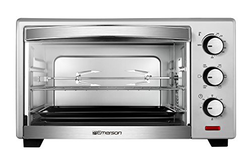 Emerson's 6 Slice, Convection and Rotisserie Countertop Toaster Oven is designed with turbo convection heat technology to cook your food faster and brown it more evenly. A spacious interior offers room for two 12 inch pizzas, or a roast, or up to 6 slices of toast. Other cooking functions include Toast, Bake and Broil. Accessories include two adjustable grill racks, a bake tray and a crumb tray. A 60 minute timer with End of Cooking Bell and Stay on Function offers additional convenience.Feature