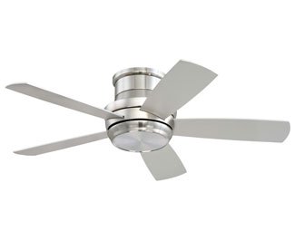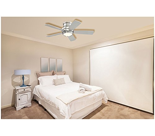This 44" Contemporary Low Profile Ceiling Fan includes: 16watt LED 3000K, 1415 Lumens, 80CRI Dimmable Light, (100watt incandescent equivalent) with Optional Brushed Nickel Blank Light Lens Cover for No-Light.