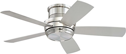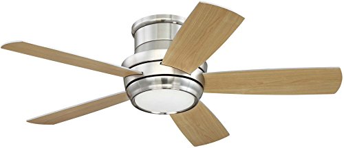 The Craftmade TMPH44BNK5 Tempo collection 44" indoor hugger ceiling fan (with remote control and light) in Brushed Polished Nickel uses LED light output and brings Contemporary style. This fan includes 5 Reversible Silver / Maple Plywood Blades and the hanging height is 7.25". The voltage is 120 volts. The Craftmade TMPH44BNK5 down light requires 1 bulb (included). Additional Information: Control - ICS Remote & Wall Controls; Glass - Matte White Glass