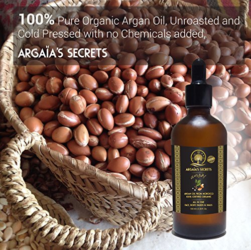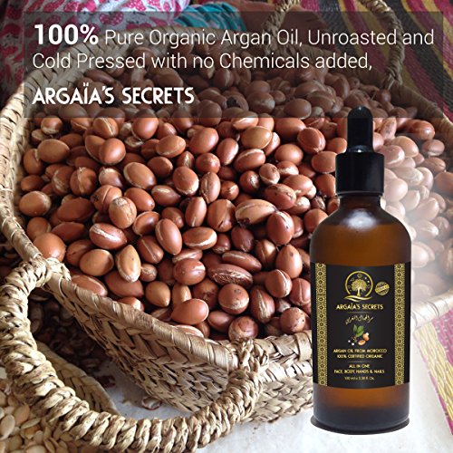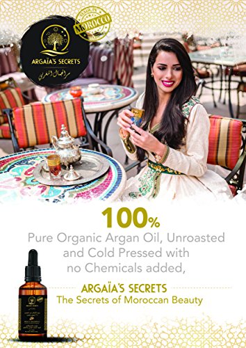 Why you should have Argaia's Secrets Organic Argan Oil: You are looking for the best Virgin Organic Argan Oil ? Argaia's Secrets Argan Oil is what you are looking for, you can purchase it with complete peace of mind, if you are not completely satisfied, we will refund your purchase. Its 100% pure certified organic premium quality, non-diluted, with no fillers and No Chemicals added, By purchasing Argaia's Secrets Organic Argan Oil here's what you'll discover: Skin Moisturiser Argaia's Secrets Organic Argan oil is most commonly used as a skin moisturiser to hydrate and soften skin. With its high vitamin E and fatty acid content, Argaia's Secrets Argan Oil is the ideal product to give skin a natural boost. It absorbs easily and is non-greasy and non-irritating, which makes it a great natural moisturiser. Hair Conditioner, Sleek and Shine Styling Argaia's Secrets Argan Oil is the ideal hair conditioner, and it can even help to treat split ends and tame frizzy hair. Also due to its ability to tame frizz and give hair shine, Argaia's Secrets Argan Oil is also commonly used as a styling agent. It makes hair more manageable and adds a healthy, attractive shine to any hair style. Anti-Aging Not only does argan oil act as an effective moisturiser, it can also give skin a youthful glow and reduce the visibility of wrinkles. Its anti-oxidant effect makes argan oil the ideal anti-aging product. It restores elasticity and leaves skin feeling plumper and softer.Feature