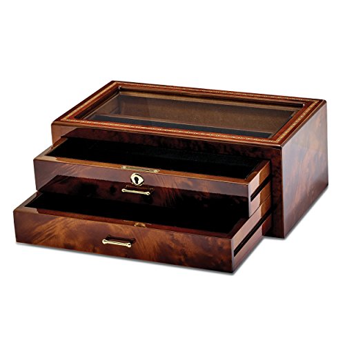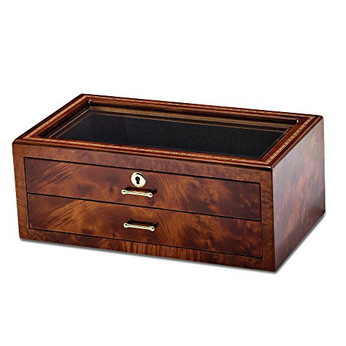 Inlay Wood Veneer Glass Window 2 Drawer Locking Collector Box