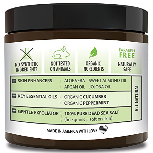 SPA QUALITY / ALL NATURAL INGREDIENTS Carefully hand blended with organic essential oils, skin smoothing enhancers and the undeniable exfoliating power of pure, fine grain Dead Sea Salts. NOTHING ARTIFICIAL: NO chemicals, NO GMOs, NO Gluten, NO preservatives, NO perfumes, NO fragrances, NO parabens, NO alcohol, NO dyes, NO animal fats, NO petroleum - NONE of the bad stuff!