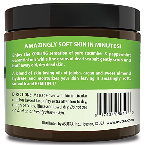 MORE THAN JUST A SCRUB - IT'S SKIN THERAPY The fine grains of dead sea salt penetrates to unclog pores minimizing blackheads, blemishes and in-grown hairs leaving skin visibly brightened. ASUTRA only uses 100% mineral rich Pure Dead Sea Salts - NATURE'S BEST EXFOLIATOR- there is a big difference! - everything on your body is 100% organic & natural.