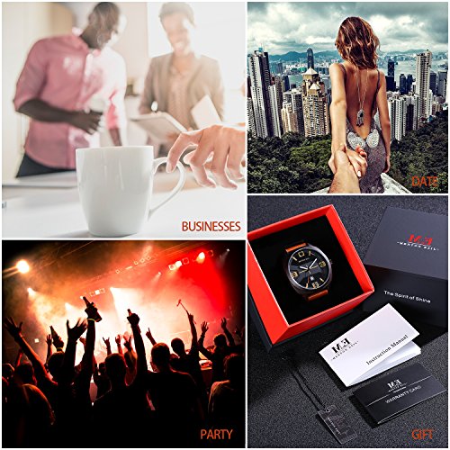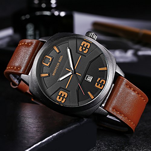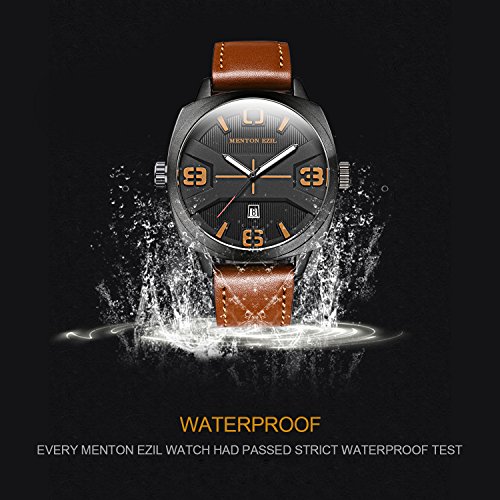-. Feature : DURABLE CASUAL BUSSINESS and SPORTS DESIGN: Luminous Pointer design helps you see the time more clear in the dark.Combine business casual and sport with classic Brown and withe color, unique Date Window Phase and leather watch band, bring you back to the classic and simplicity. Also make it a great gift for family or friends / COMFORTABLE ADJUSTABLE LEATHER BAND STRAP: High quality brown Genuine Leather band with Buckle provide comfortable wearing experience and convenient to adjust the wirst, fits for all wrist sizes / PRECISE TIME KEEPING: Japanese Quartz Movement provides precise and accurate time keeping.High hardness mineral glass to protect the watch front / WATERPROOF TO 30M: Support to swim and bathe in cold water. Excellent shockproof and anti-frost performance, suitable for all kinds of sports and outdoor activities / GIFT PACKAGE: 1x Menton Ezil Mens Sport Watch, 1x Classic Watch Box, 1x Watch Operation Instruction. A perfect present for father,grandfather,boyfriends,husband,boys or yourself on Father's Day, Christmas, Birthday, Anniversary, Valentines Day