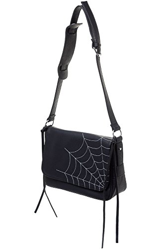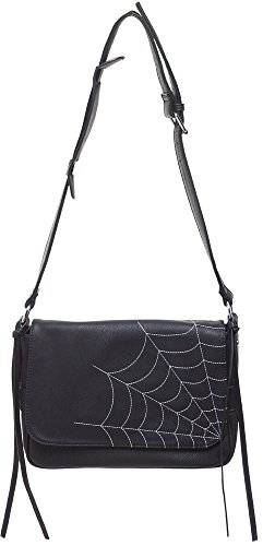 Studio : Sourpuss Publisher : Sourpuss Product Description Get your cheap thrills with our Spiderweb Cheap Thrills Purse! It's made of a sturdy, black faux leather and is embroidered with a classic spiderweb. The exterior has a zippered closure, as well as a magnetic snap securing the front flap. The interior is spacious with two open pockets and one zippered pocket. The lengthy, adjustable strap comes with a comfy shoulder enforcement and fringe accents, this purse is going to be one you reach for again and again! 0