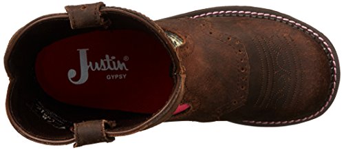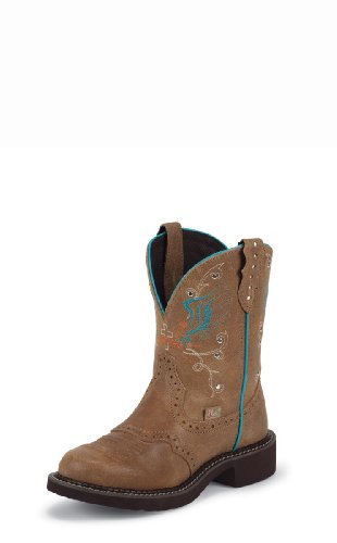 The sassy and versatile Justin Gypsy Cowgirl boot is wardrobe bliss This rider-friendly boot features distressed brown leather foot under a fancy stitched 8" leather shaft. Teak leather pipingfort fabric mesh lining. Patent pending "Gypsy" riding boot rubber outsole. Sturdy unit heel. Single stitched welt. Round toe profile. Shaft circumference is 13" (based on a size 6B).Feature