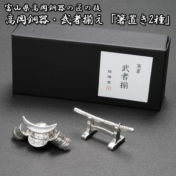 緻密であり小さくても存在感のある伝統技。「高岡銅器」一品。美しい箸置き2種セット。富山県高岡市に息づく伝統産業「高岡銅器」その匠の技が光る、「本物」に触れる絶好の機会です。メタリックに輝く、銅製の箸置き。戦国武将が愛した数々の品が、小さくとも精密にそして美しく表現された一品。選りすぐりの2種。「兜」と「刀」の2種セット。お食事のたびに、ぜひご愛用いただきたい箸置き。伝統の技を、美味なお食事と共にご堪能ください。ギフトにもお喜びいただける品です。■商品サイズ:兜/H25×W50×D30、刀/H20×W60×D20mm
