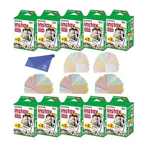 Fuji Instax Mini Instant Film 10 Pack (Total 200 Shoots) with Microfiber Cleaning Cloth and 100 Pieces Sticker for Fuji Mini 90 8 70 7s 50s 25 300 Camera SP-1 Printer