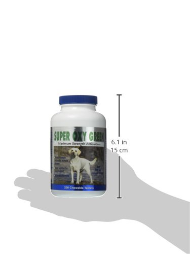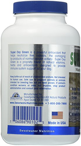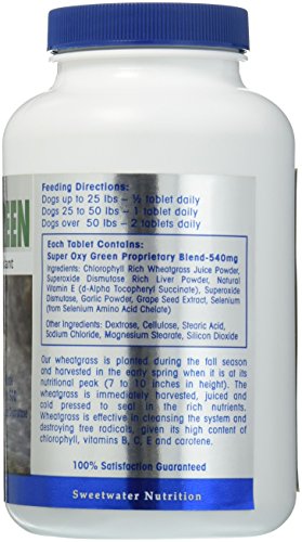 Super Oxy Green is a natural blend of vitamins, minerals, enzymes and anti-oxidants that work together to help neutralize and protect the body against the damaging effects of harmful free radicals that are formed during the normal metabolic process. Made with superoxide dismutase (an effective and powerful free radical scavenger), wheatgrass concentrate (a highly concentrated source of vitamins and minerals), garlic (known for its anti-inflammatory, anti-bacterial and anti-oxidant properties) and Vitamin E (to keep the immune system functioning properly). Directions: Recommended daily dose: One tablet per 40 pounds of body weight. For best results, use with InflamAway products.
