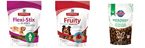 -. Title : Hills Science Diet Dog Treats 3 Variety Bundle Soft & Chewy Training Treats Chicken, Crunchy Fruity Snacks with Cranberries & Oatmeal and Flexi-Stix Jerky Dog Treats