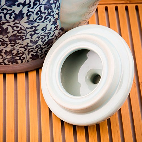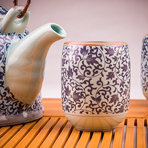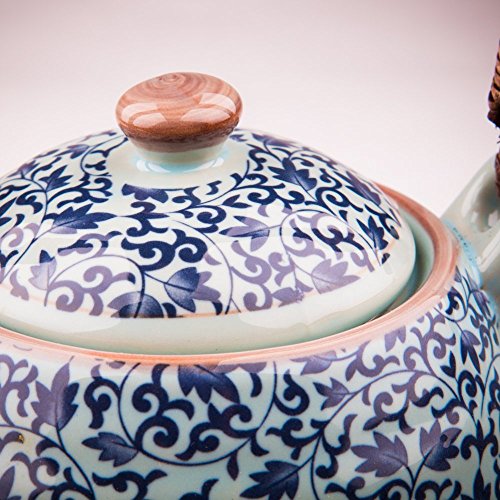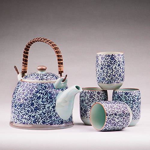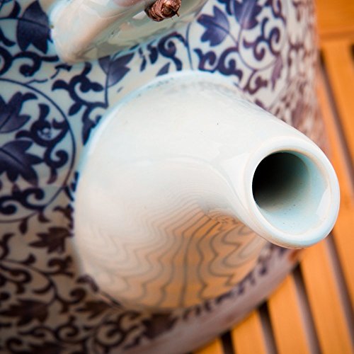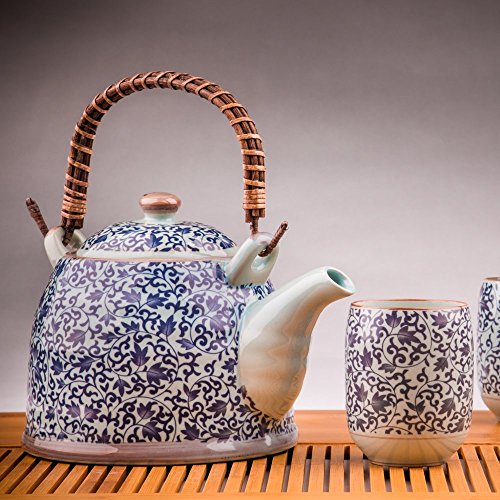 Studio : Tea of Joy Publisher : Tea of Joy Product Description This beautiful porcelain teapot is adorned with the traditional and elegant blue floral design in blue-white background. Includes stainless steel loose leaf tea infuser and 4 matching tea cups. Place your favorite tea cup, steep and enjoy. This tea set includes one large teapot and four matching porcelain teacups. It also comes with a stainless steel tea infuser and a removable bamboo handle for easy lifting and storage. With the association of abundance, prosperity, and good luck. This tea set is the perfect gift for someone who loves the oriental culture, who has the passion to pursue prosperity, who deserves a true appreciation. The symbolism in flowers is many and varied, and each flower has its own entry in this survey of symbols. The Chinese have kept attractive gardens from early times, and?courtyard homes?had a small?garden?at its heart. Early Spring blossom was particularly valued and decorated houses for the?Spring Festival. Teapot measurement: Hight: 7in. Width: 6in. Volume: 32 oz. Teacup measurement: Hight: 3in. Width: 3in. Volume: 8 oz. 0