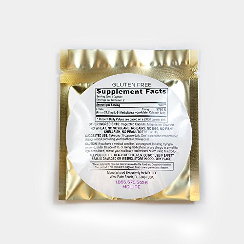Studio : MD.LIFE Publisher : MD.LIFE Binding : Health and Beauty Product Description Size:2 Caps Optimized Folate (L-Methylfolate), 15 mg, 2 vegetarian tablets. Folate is involved in neurotransmitter synthesis and critical enzymatic reactions throughout the body. By depleting excess homocysteine, folate benefits cardiovascular health and nervous system function. Those who take ordinary folic acid supplements, however, may not be experiencing its full spectrum of effects. This is because once ingested, not everyone converts folate to its biologically active form called 5-methyltetrahydrofolate (5-MTHF). Research shows that in a large proportion of the population, genetic enzyme deficiencies prevent the conversion of folate to 5-MTHF, leaving many vulnerable to low blood folate levels (and higher than desired homocysteine). A more useful approach is to take the bioactive folate 5-MTHF directly, which has been declassified as a drug and is now available as a dietary supplement. 5-MTHF has been shown to dramatically raise blood serum folate levels compared with folic acid supplementation. This bioactive folate is up to seven times more bioavailable than folic acid. This greater bioavailability is especially important in people who have a genetic enzyme deficiency since it requires no conversion to become metabolically active. 0