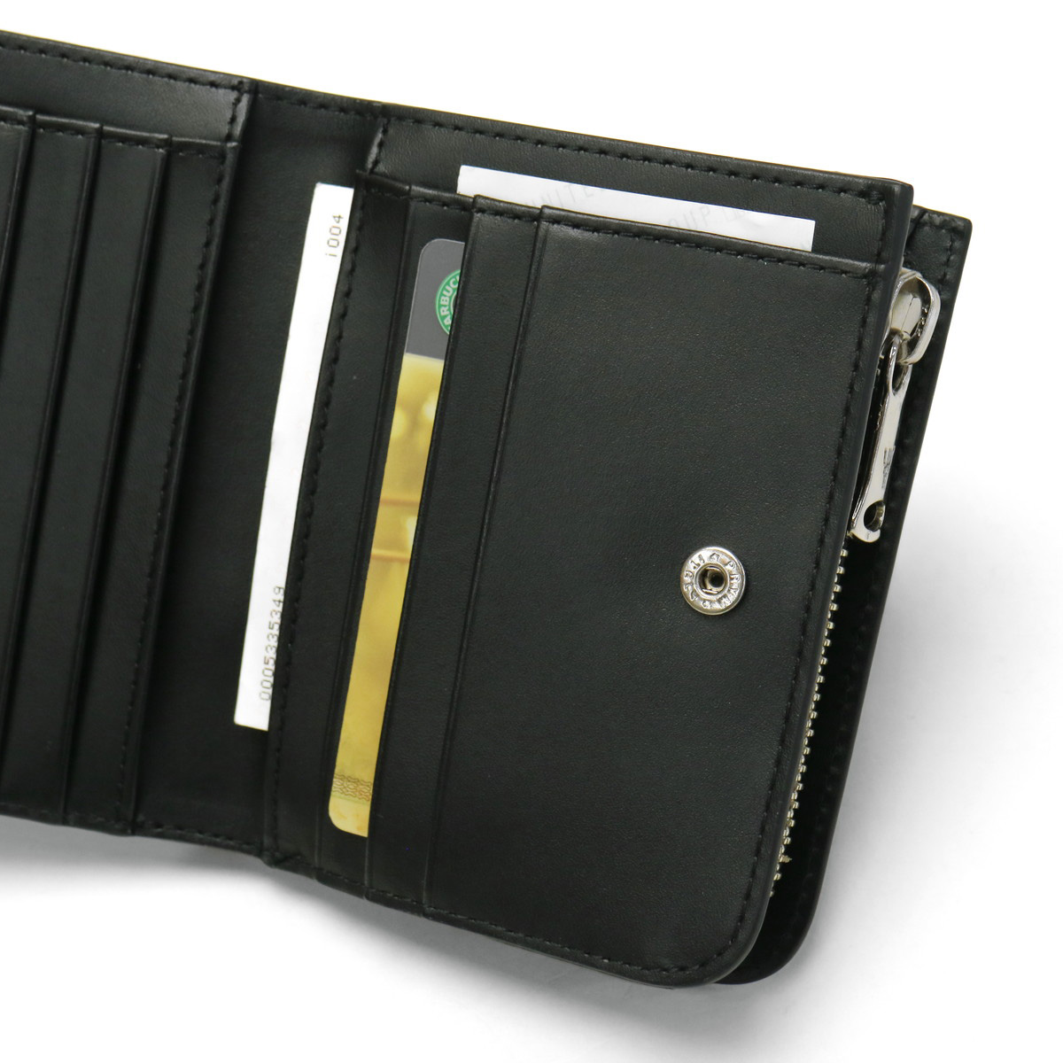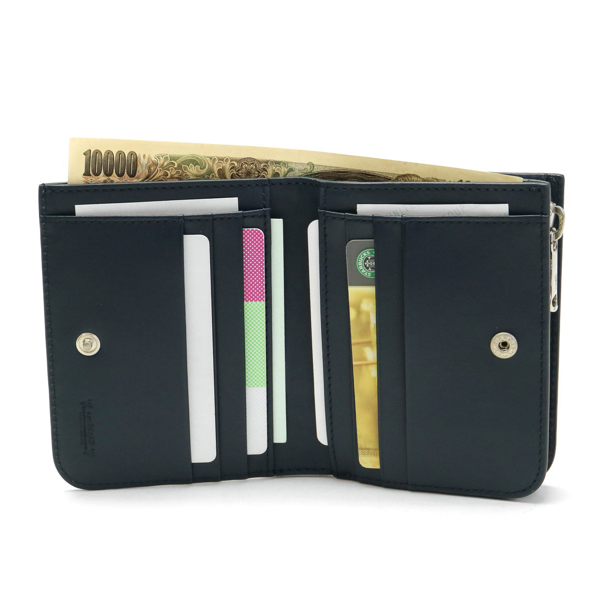 Snap fastened storage, equipped with 10 card pockets and wallet. It is also safe for people who tend to have more cards. Outside has an coin purse that opens in an L shape, it can be separated by type with a partition.