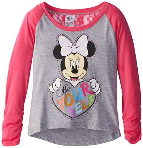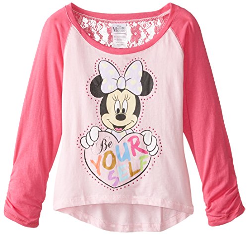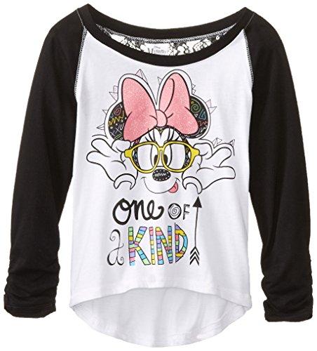Long-sleeve baseball tee featuring contrast coverlock stitching, hi/low hem, and glitter Minnie Mouse screenprint Lace pattern at back yoke Brand : Disney EAN : 0887648225541 Package Dimensions(LxWxH) : 23x17x2cm ; 68 g