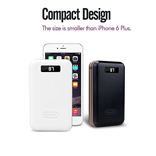 -. Binding : Wireless Phone Accessory -. Brand : imuto -. Feature : 20000mAh Capacity and Compact Size: Taurus X4 is smaller than iPhone 6 Plus, and charge iPhone 6 almost 8 times, iPad Air almost 1.7 times, Galaxy S6 almost 5.7 times, Galaxy Note 4 almost 4.8 times. For New Macbook, please buy another USB to Type-c Cable, X4 can charge New Macbook almost 1.2 times. / Exclusive AI Power Technology: Both USB ports detect your device intelligently and delivers the faster charge. 2USB ports (2.1A & 1A) charge 2 devices at the same time. / Smart Digital Screen shows remaining power in digital format, and it's hidden until activated. Taurus X4 fits for almost all USB-powered devices. With built-in LED flashlight. / Multiple Smart Protection System: keeps your devices safe from over-charging, over-voltage, over-current, and short circuit. / What You Get: Taurus X4 Portable Battery External Battery Power Bank, Micro USB cable, Travel waterproof pouch, User guide(Back of outer paper), our 24-month warranty and friendly customer service. -. Label : imuto -. Manufacturer : imuto -. PackageQuantity : 1 -. ProductGroup : Wireless -. ProductTypeName : WIRELESS_ACCESSORY -. Publisher : imuto -. Studio : imuto -. Title : iMuto 20000mAh Compact External Battery Power Bank Portable Charger with Smart LED Digital Display and Quick Charge, Backup Battery Pack Camping Portable Battery Charger for iPhone 6 6S Plus 6+ 5S 4S, iPad Air 2 mini 3 Pro, Samsung Galaxy Note 4 5 3, S6 Edge S6 S5 S4, Tab, Google Nexus 6 5 4, LG G3 G4, HTC One M8 M9, Motorola Moto X, SONY Xperia Z3 4 2, PS Vita, Gopro, Smart Phones and Tablets
