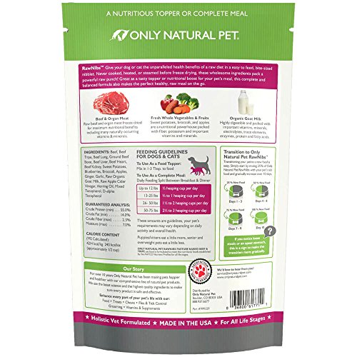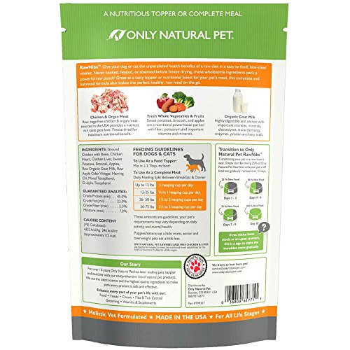 -. Feature : REAL RAW NUTRITION in a freeze dried, bite sized nibblet format with real raw muscle & organ meat, fresh fruits & veggies, and raw goat's milk. The convenience of kibble, but the taste and nutrition of raw. / USE AS A TOPPER OR TREAT so your pet can enjoy a healthy protein & nutrient boost to everyday meals or as a high reward treat. It also makes a complete & balanced meal - especially for smaller pets. / MADE IN THE USA from high quality, naturally raised meat sources - including free range venison, wild caught fish, pasture raised beef, and cage free chicken. / GRAIN FREE & ALL NATURAL is healthier for your pet. RawNibs contain no grains or gluten and have no artificial flavors, colors, or preservatives. / SATISFACTION GUARANTEE - Only Natural Pet products always include a 100% Satisfaction Guarantee. Only Natural Pet uses only the highest quality ingredients in our recipes. Providing you & your pet the highest quality products is our top priority.