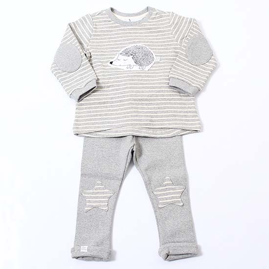 상품설명-편하게 입힐수 있는 다이마루 상하복으로 가슴에 고슴이 프린트 포인트와 바지에 별 패치가 포인트입니다.