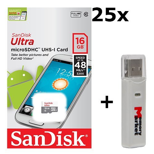 -. Title : 25 PACK - SanDisk Ultra 16GB UHS-I Class 10 MicroSDHC Memory Card Up to 48mb/s SDSQUNB-016G LOT OF 25 with USB 2.0 MemoryMarket dual slot MicroSD & SD Memory Card Reader