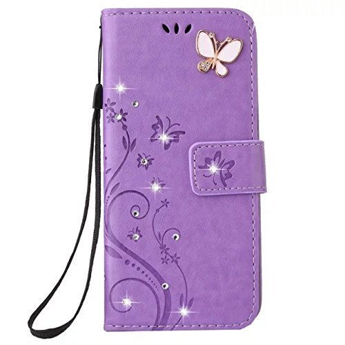 Auroralove iPhone 5/5s/se Luxury Handmade Bling Rhinestone Soft Slim Flip Stand Wallet Case for iPhone 5/5s/se Flower Butterfly PU Leather Case for Girls Women-Purple